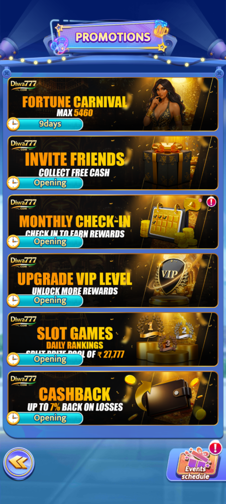 Diwa 777 Game ek online slot based game hai jisme 777 pattern aur reel system use kiya jata hai Game me colorful symbols aur fast spin system hota hai jo har spin ke saath naya excitement create karta hai