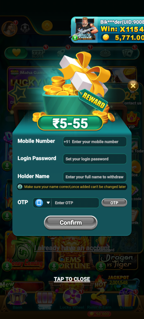 Maha Games app open kare. Register ya Sign Up option par tap kare. Apna mobile number enter kare. Mobile par aaya hua OTP dale. Username aur password set kare. Submit karte hi account create ho jata hai.