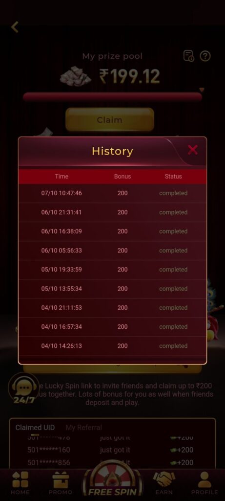 You all can get a lot of free bonuses in this app. And you can get all of them. You can also get a lot of commission in this. You can also get a free spin bonus by spinning in this app. You will get ₹200 as a free spin bonus. The more referrals you all get in a day, the more spin bonus you can get.